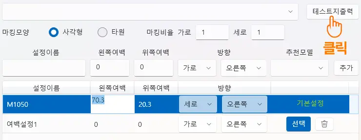 (기타 프린터기 일경우 용지 방향만 설정하고 여백값들은 0인 상태에서부터 시작해서 맞춰감)
